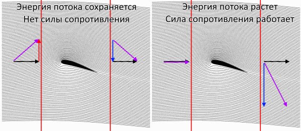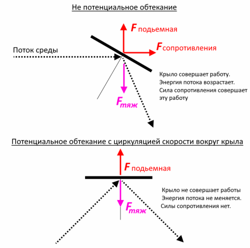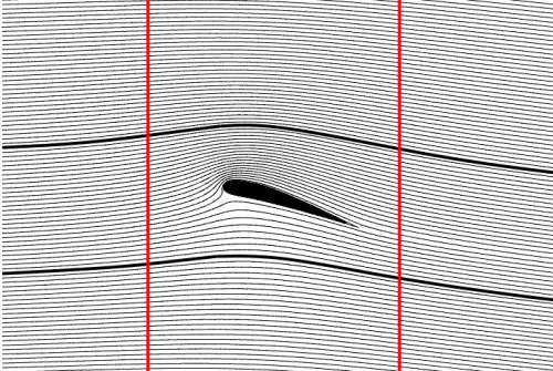 Нас интересует происхождение подьемной силы. Допустим, что на крыло действует вертикальная сила, направленная вниз (нагрузка), а силу тяжести мы не учитываем (т.е. среда не имеет веса). В таком случае вычислив эти интегралы по поверхности любого контура, включающего крыло, мы получим одну и ту же силу