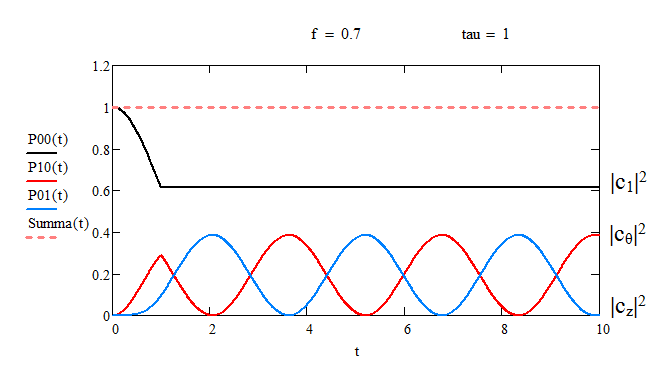 Согласно пояснению amon, в частном случае - с внешней силой в виде импульса длительностью $\tau$ с П-образной огибающей, т.е. $F(t)=fe^{-i\varepsilon t},$ где $f$ это не равная нулю постоянная при $0<t<\tau,$ а вне этого промежутка времени $f$ равна нулю, - решение легко выводится аналитически. Начальное условие при $t=0$ у нас такое - атом не возбуждён и поле в резонаторе не возбуждено (ноль фотонов): $$|\Psi(0)\rangle=1\cdot |0,0\rangle +0\cdot |1,0\rangle+0\cdot |0,1\rangle$$ Решение $|\Psi(t)\rangle$ при $t=\tau$ даёт нам новые значения коэффициентов в такого рода суперпозиции базисных состояний. Эти новые значения коэффициентов служат новым начальным условием для решения $|\Psi(t)\rangle$ при $t>\tau.$ В общем виде решение при $t>\tau$ нам уже известно: это суперпозиция упомянутых выше трёх стационарных состояний (стационарных, потому что внешняя сила, возбуждающая атом, равна нулю при $t>\tau).$ Квадраты модулей коэффициентов такого решения при базисных векторах состояния дают нам вероятности; ниже на рисунке они у меня обозначены так: