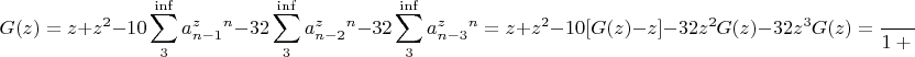 ![$$G(z)=z+z^2 - 10\sum_3^{\inf}{}a_{n-1}^z^{n}-32\sum_3^{\inf}{}a_{n-2}^z^{n}-32\sum_3^{\inf}{}a_{n-3}^z^{n}=z+z^2-10[G(z)-z]-32z^2G(z)-32z^3G(z)=\frac{z+11z^2}{1+10z+32z^2+32z^3}$$ $$G(z)=z+z^2 - 10\sum_3^{\inf}{}a_{n-1}^z^{n}-32\sum_3^{\inf}{}a_{n-2}^z^{n}-32\sum_3^{\inf}{}a_{n-3}^z^{n}=z+z^2-10[G(z)-z]-32z^2G(z)-32z^3G(z)=\frac{z+11z^2}{1+10z+32z^2+32z^3}$$](https://dxdy-04.korotkov.co.uk/f/f/c/d/fcdac232d5ffb4bee6aa927037e41ae382.png)